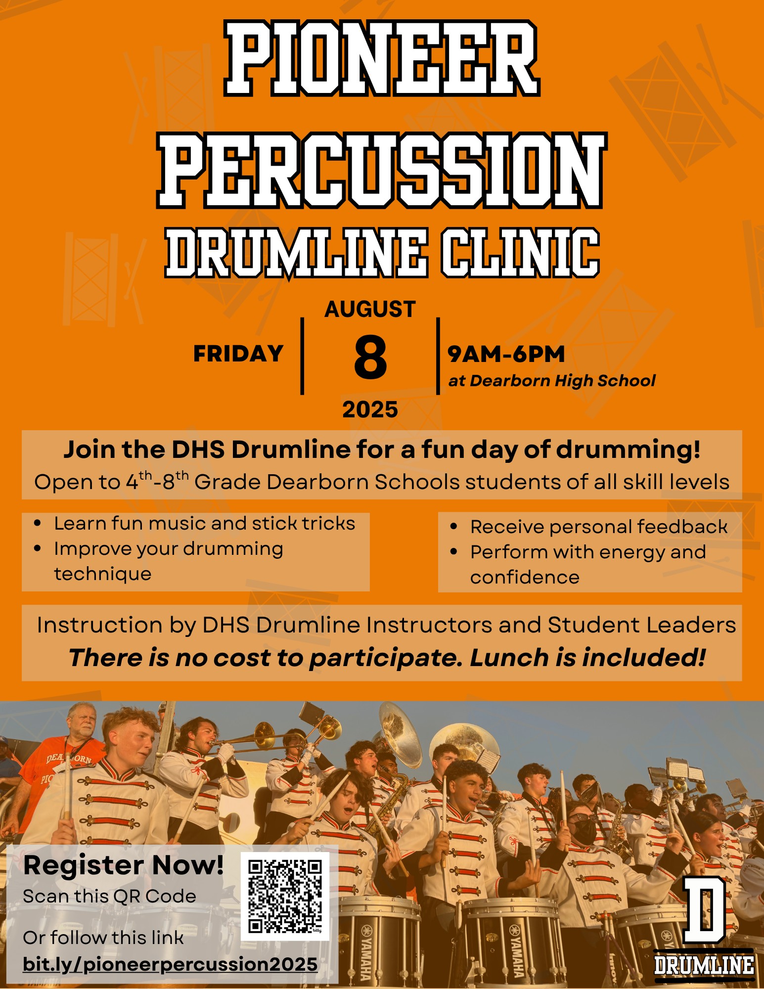 Join the Dearborn High Drumline for a fun one-day clinic on Friday, August 8, 2025, from 9 AM–6 PM. Learn new skills, meet the team, and have a blast drumming!